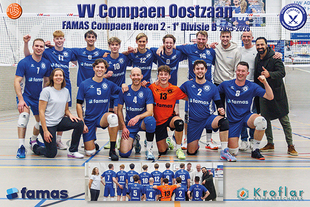 VoV, 03-12-2025. 6:00 uur. De herenlijn van volleybalvereniging Compaen heeft de wind momenteel stevig in de zeilen. Het eerste team staat tweede in de Topdivisie en het tweede en derde zijn nu koplopers in respectievelijk de Eerste Divisie en Promotieklasse. Die laatste twee ontsnapten vorig seizoen nota bene nog aan degradatie in de beslissingswedstrijden.