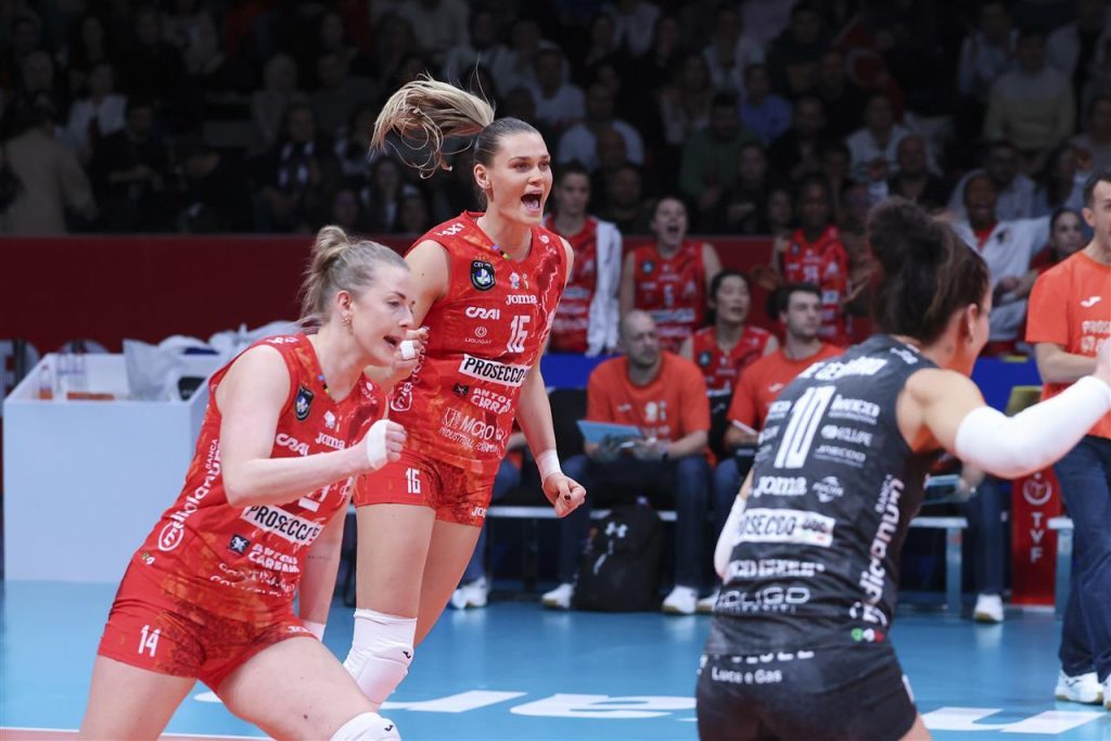 In de eerste set liep de thuisploeg vlot uit naar een 11-4 voorsprong, Conegliano had toen beide time-outs al gebruikt. Het vervolg was voor de Italiaanse ploeg, met een 4 om 12 score namen ze bij 15-16 de leiding over met Nika Daalderop vanaf 9-3 passend in het achterveld. Zeren Spor kon tot 19-19 gelijke tred houden, een blokpunt van Sarah Fahr en misscommunicatie aan de Turkse kant van het net zorgden voor 19-22, bij 21-24 blokkeerde Isabelle Haak Conegliano naar de setwinst.