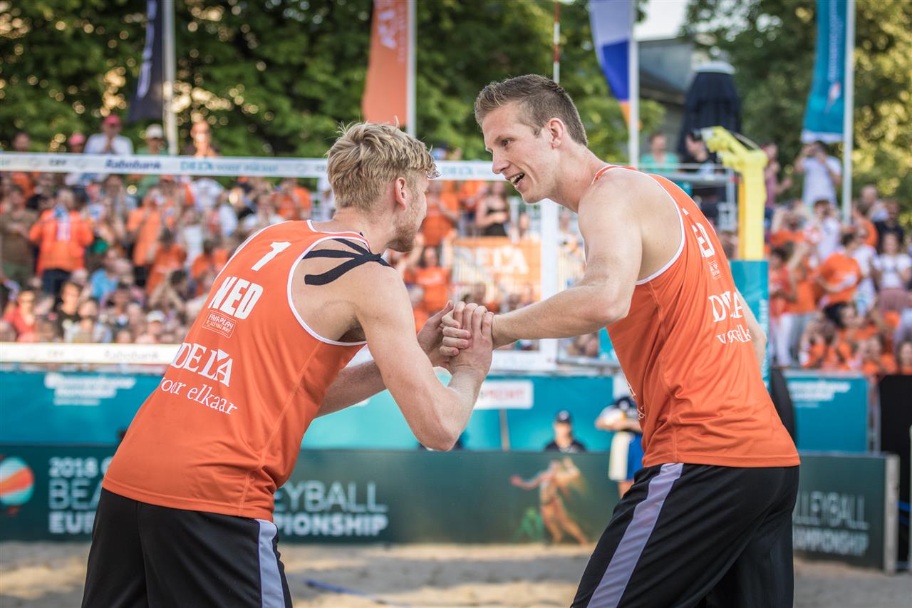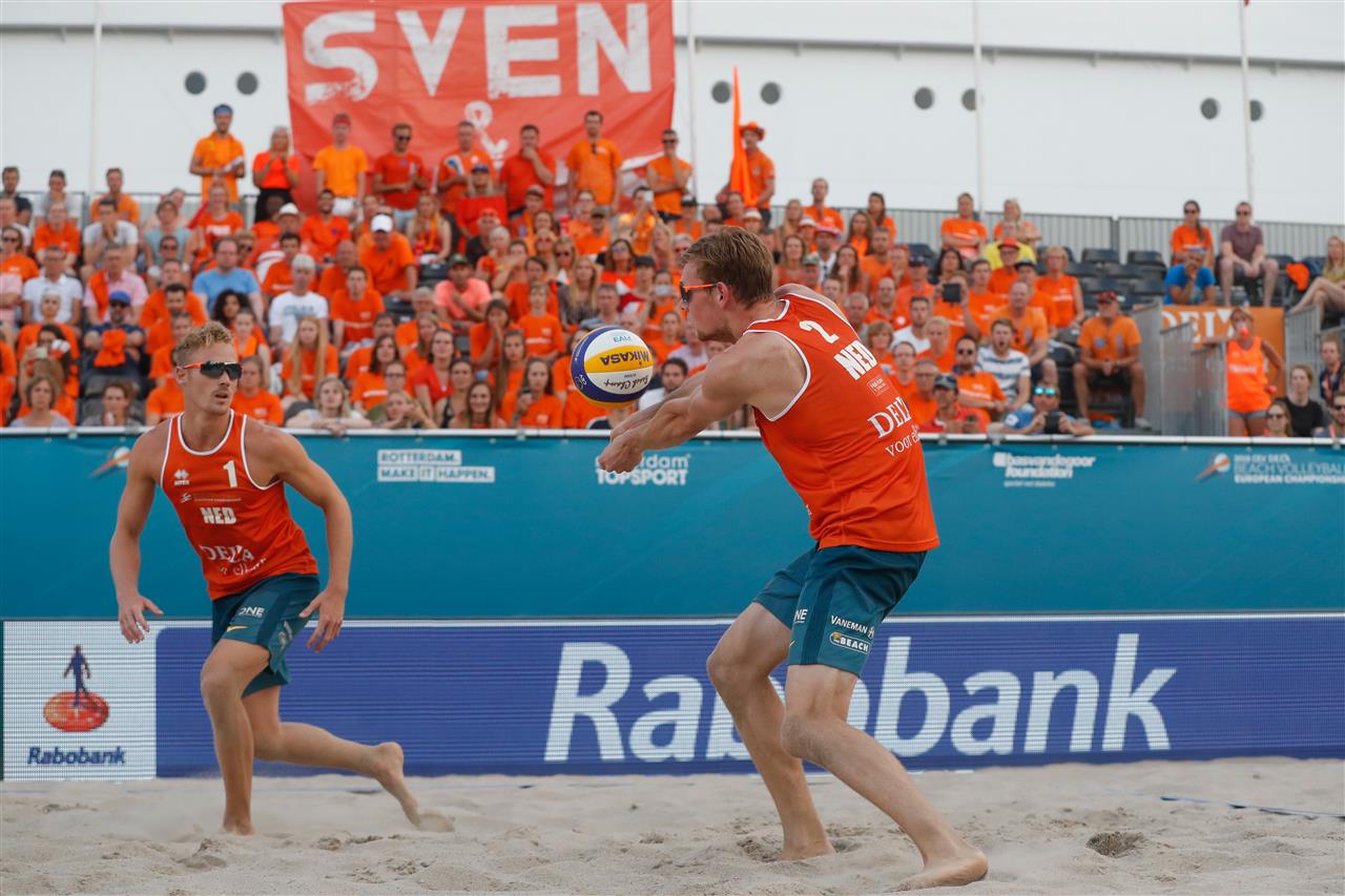 VoV, 17-07-2018. 6:30 uur. Het was ‘mannendag’ gisteren bij het EK Beach in Nederland. Drie Nederlandse mannenduo’s speelden hun eerste partij, nadat de openingspartij eergisteravond voor rekening was gekomen van door Dirk Boehlé / Steven van de Velde. Die ze overigens wonnen.