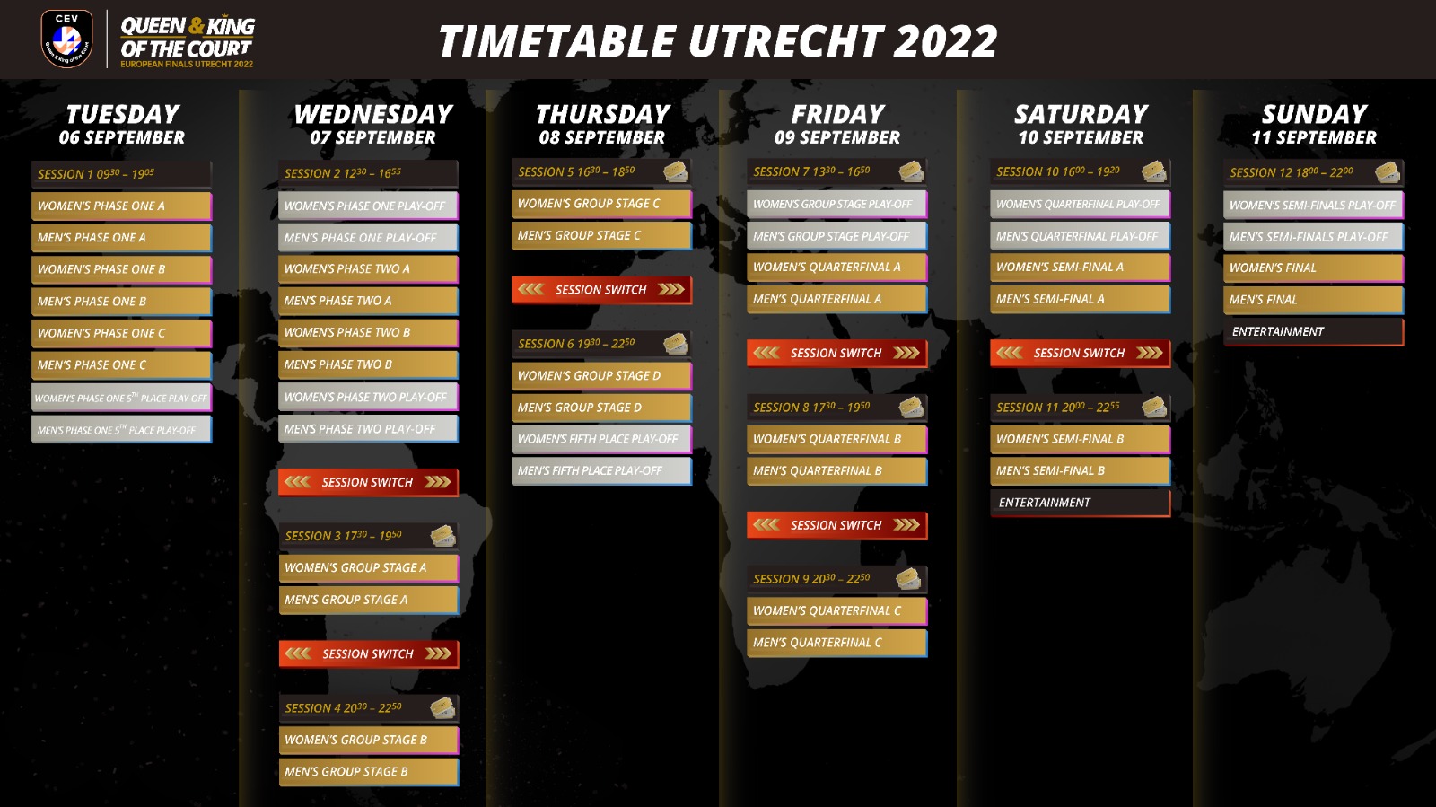 VoV, 01-09-2022. 16:04 uur. Van 6 tot en met 11 september wordt in Utrecht de eerste CEV Queen & King of the Court European Finals 2022 gehouden in de BetCity Arena op het Jaarbeursplein.