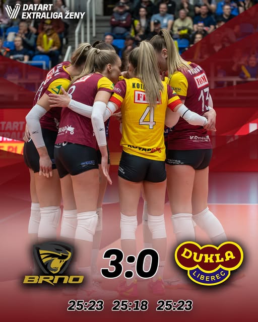 Gisteravond konden ze dus in Brno de titel behalen en mee naar huis nemen. Maar dat ging niet door. Met een 3-0 zege bracht Selma Brno de stand op 2-1 in wedstrijden. De eerste en derde set werden met twee punten verschil beslist (2 keer 25-23), de set ertussen ging met een ruime 25-18 naar de thuisploeg. Liberec is dus nog steeds één overwinning van de titel af.
