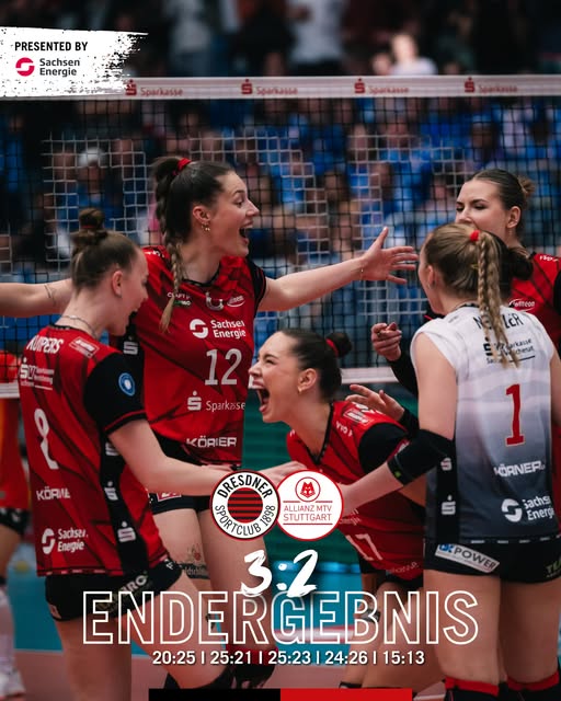 VoV, 09-04-2026. 11:28 uur. SC Dresden had door de 2-3 uitzege bij MTV Stuttgart de beste uitgangspositie om het ticket voor de finale in Duitsland binnen te hengelen. Op zichzelf verrassend gezien de resultaten in het reguliere seizoen waarin MTV Stuttgart met vlag en wimpel eerste werd. Dat Stuttgart ‘met het mes tussen de tanden’ weerstand zou bieden leek logisch en gebeurde ook. Uitschakeling in deze fase zal niet in hun scenario zijn opgenomen. In Stuttgart had het ook helemaal anders kunnen uitpakken, Dresden stond daar een aantal keren dichter bij verlies dan bij winst.