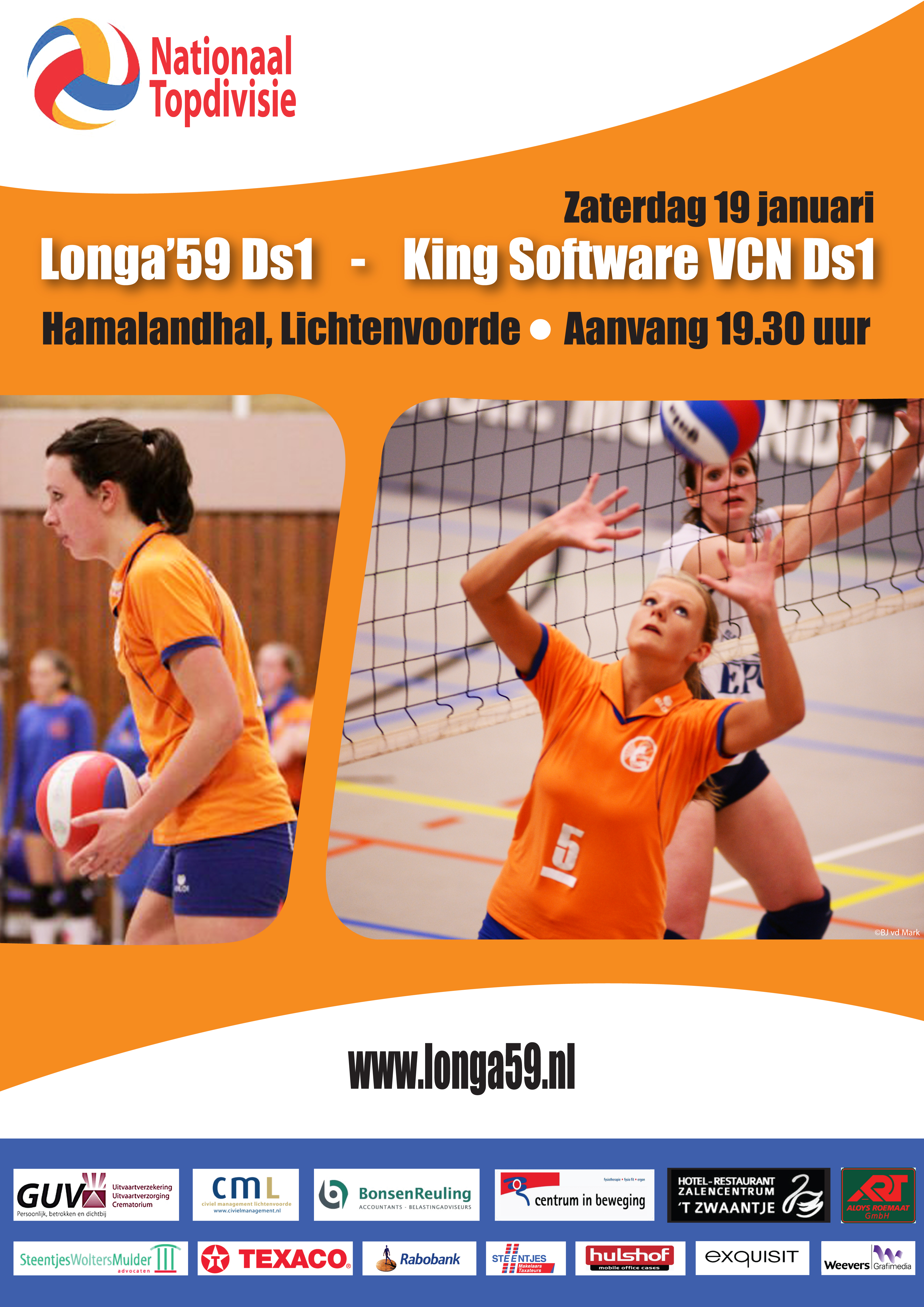 Zaterdag staan in Lichtenvoorde twee ploegen tegenover elkaar, die 2013 met een nederlaag begonnen. Longa ’59 was het eerste team dat in Sliedrecht een nederlaag leed, en koploper King Software VCN kreeg de stuntploeg van Zwaluwhoeve / HSC er niet onder in Capelle. Mooie uitgangsposities voor het onderlinge duel tussen de verliezers van afgelopen zaterdag. (Lees verder onder de poster)