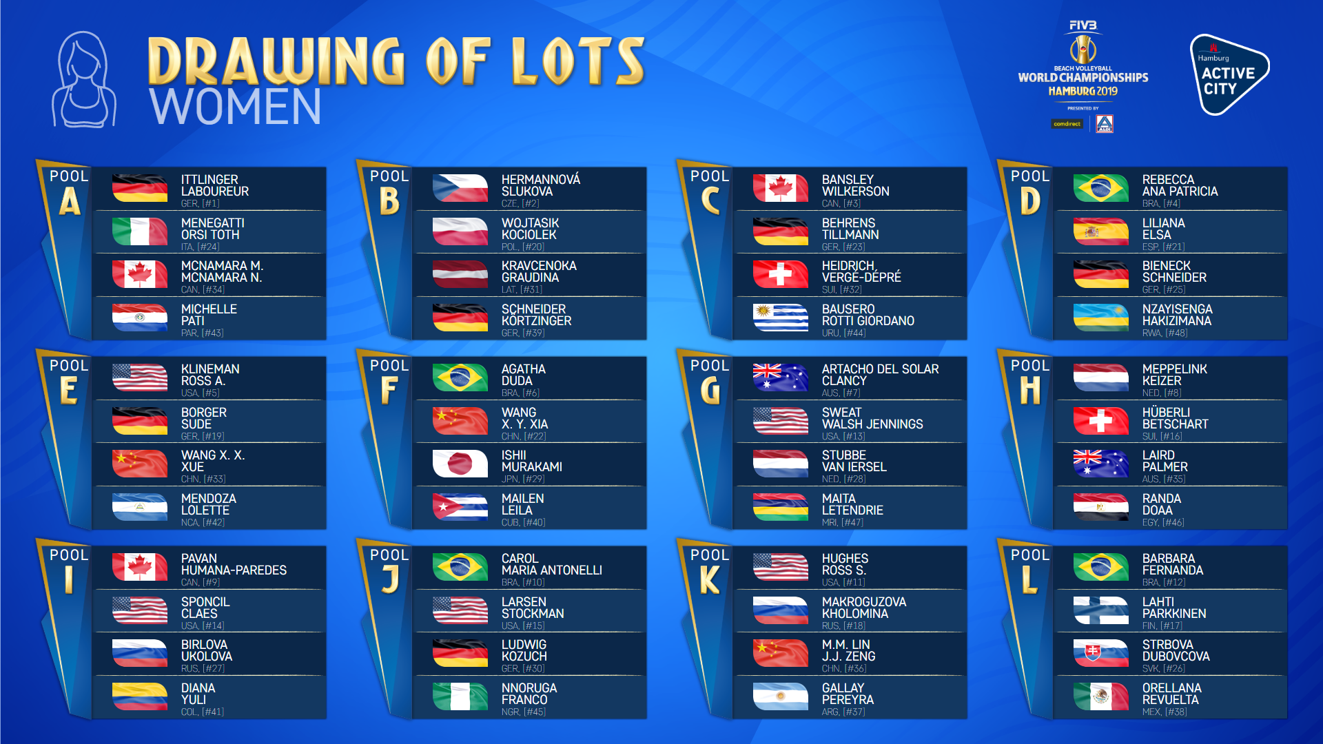VoV, 05-09-2019. 7:00 uur. Gisteren vond de loting plaats voor het WK Beachvolleybal, dat van 28 juni t/m 7 juli in Hamburg in het Rothenbaum stadion wordt gespeeld. Met twee damesduo’s en één heren duo is Oranje bij dit WK present. De wereldkampioen verdient een Olympisch ticket voor zijn of haar land.