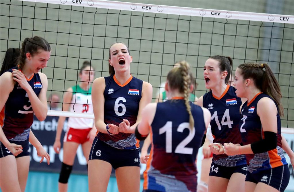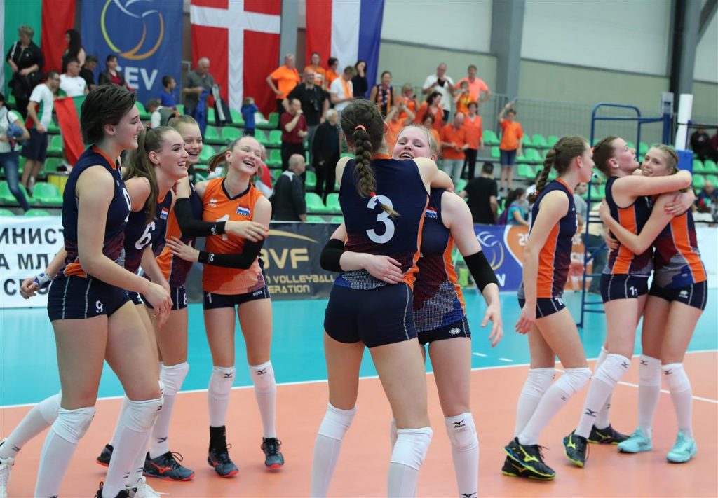 Tegen Denemarken begon de bondscoach met het volgende zevental: Sanne Konijnenburg op spelverdeling, Sophie Posthumus als libero en Nicole van de Vosse op de diagonaal. Tess Leemreize en Noa de Vos vulden de rol van passer loper in en Emily Silderhuis en Marije ten Brinke waren de midspeelsters. In de loop van de wedstrijd kregen Sanne Wagener, Silke Bos, Dagmar Mourits, Joanne Brilhuis en Sabine de Groot ook speeltijd in de starting seven of als invalster.
