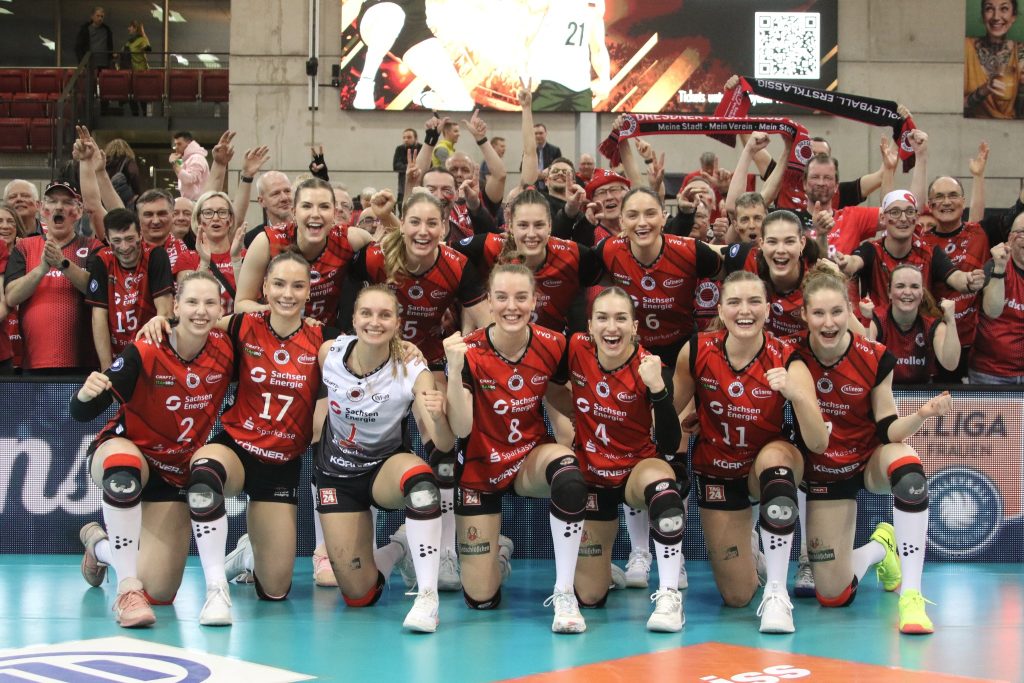 Stuttgart dat in het reguliere seizoen met vlag en wimpel eerste werd kon het deze keer tegen een heel hardwerkend SC Dresden niet bolwerken. Twee keer gaven ze een voorsprong in sets uit handen. De ploeg van Jette Kuipers en Rosa Entius maakte eerst met 18-25 de met 25-20 verloren eerste set ongedaan, daarna zorgde 22-25 voor een gelijke 2-2 stand nadat de derde set met 25-15 was verloren.