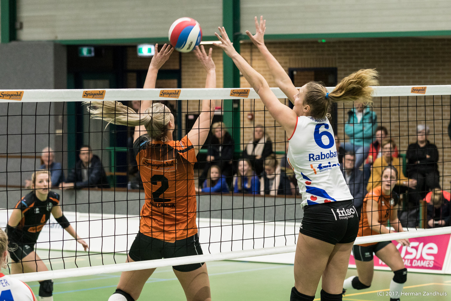 Scores van Lieze Braaksma en zo’n laffe ace via de netrand van Nienke Tromp dwongen Set-Up bij 4-0 in de time out. Het verschil van een punt of drie à vier hield de thuisploeg vast tot aan 8-4, Marianne het Lam – Scholten maakte de 9-7 even later. Een serveserie van Roos van Wijnen dwong Tom Engbers bij 13-7 zijn tweede time out op te nemen. Set-Up kon tot 14-10 terugkomen, kreeg een driepunter tegen en had bij 17-10 een hele ruime achterstand opgelopen.