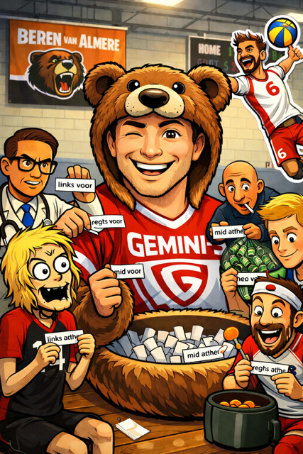 VoV, 09-04-2026. 11:48 uur. “Laten we het gewoon doen. Lache toch?!” Erik glunderde met samengeknepen pretoogjes, door het idee, dat er tijdens de derde set tegen Voleem werd geopperd. Martijn: “We hebben met weinig moeite, de wedstrijd gewonnen, 3-0 en we spelen echt op z’n 38ste.” Tim tikte zijn broer aan: “Ben jij 38?” Martijn pakte zijn bidon van de bank en zei: “Even serieus nu, we kunnen best de laatste set even heel iets anders doen.” Erik: “Ja toch, met 25-20, 25-23 en 25-20 hebben we gewonnen. Die laatste set maakt niks meer uit.