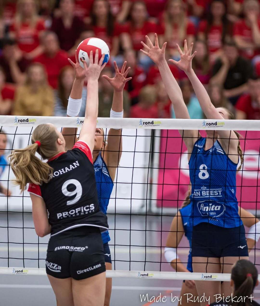 In de eerste set schoot Eline Rohaan met scherp. Vanaf de opslaglijn, vanaf de drie meter en vanaf de buitenkant. We telden in deze set een tiental punten van haar. Samen met de omloopscores van Emily Silderhuis forceerden ze het ruime verschil in de tussenstanden na een gelijk opgaande strijd tot 6-6. Sliedrecht ging bij 9-12 de time out in, Roos Grooters liet de 11-16 en 12-17 op het scorebord zetten. Lana Lijkendijk en Evie van Kerkvoorde hielden het verschil op een punt of vijf, maar konden hun ploeg niet dichterbij brengen. Via Roos Grooters (17-23) en Eline Rohaan (19-24) pakte Apollo 8 de setwinst na een in het net geslagen aanval.