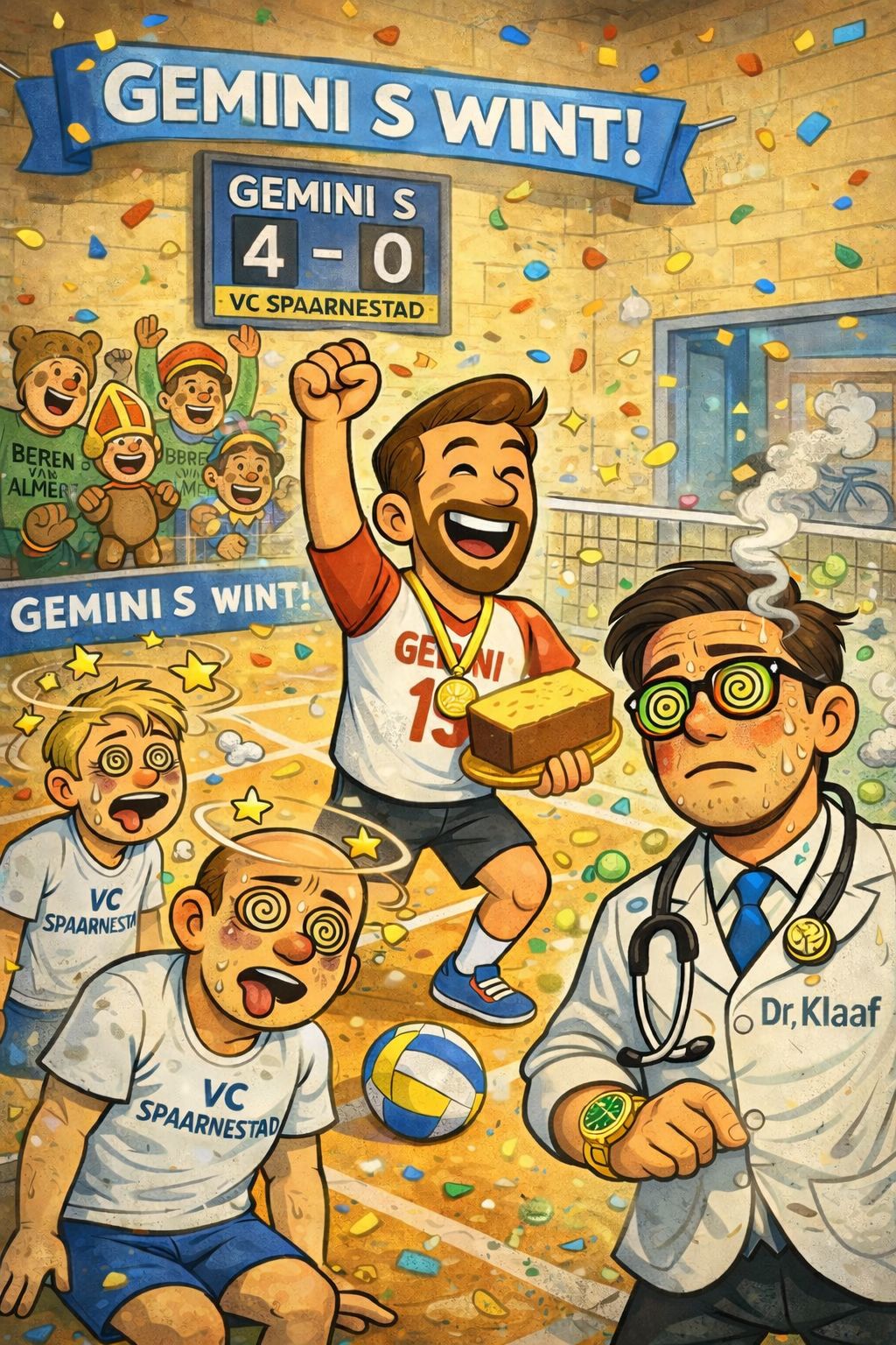“Nu even serieus” ging Bas verder “dit zijn de wedstrijdjes voor de knikkers. Laten we omkleden en…” hij stopte midden in de zin en keek naar Klaver die tegen de ramen van de kantine een varkensneus aan het drukken was en een beetje loenste. “Laten we allemaal een beetje letten op Klaver, hij eeh…HEJ KLAVER! Ben je OK?” Erik grijnsde: “Misschien dat ie een lange nachtdienst heeft gehad, wat kan het anders zijn?” En met die woorden ging Gemini S heren 1 dan eindelijk richting het volleybalveld.