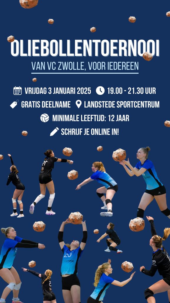 Praktische informatie: Het Oliebollen Buurttoernooi vindt plaats op vrijdag 3 januari om 19.00 uur in Landstede Sportcentrum (Zwolle). Iedereen die ouder is dan 12 jaar is welkom: je hoeft dus géén lid te zijn van VC Zwolle.