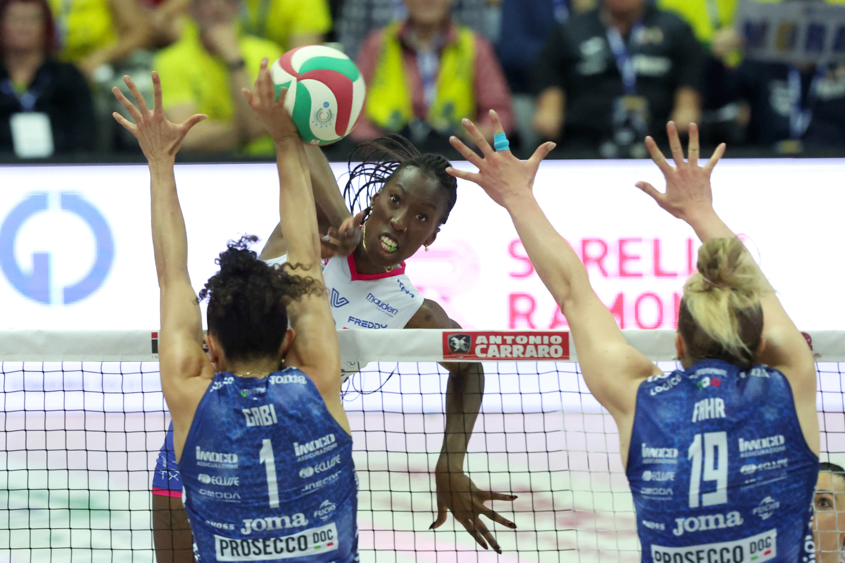Vero Volley Milano was in de eerste set vanaf het begin (1-4) via het midden 7-11, 11-15) tot aan het eind de ploeg op voorsprong (19-23, 20-25) en pakte de 0-1 setwinst. In set twee kon Conegliano na 10-9 het verschil forceren (15-13, 21-17) en met 25-20 brachten ze de stand op 1-1.