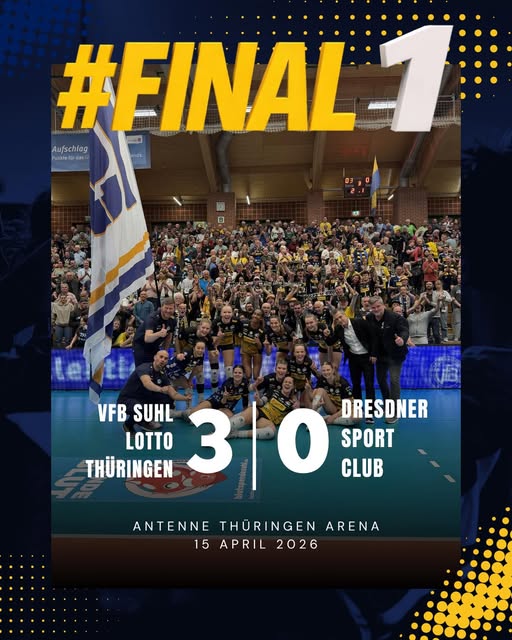 In de eerste set was er bij 7-5 de eerste time out van SC Dresden, een 14-11 achterstand was voor 1.800 toeschouwers bij begin van de big points helemaal ongedaan gemaakt (20-20). Na de time out voor Suhl op die stand forceerden ze aanvallend en serverend het verschil voor de 25-22 zege.
