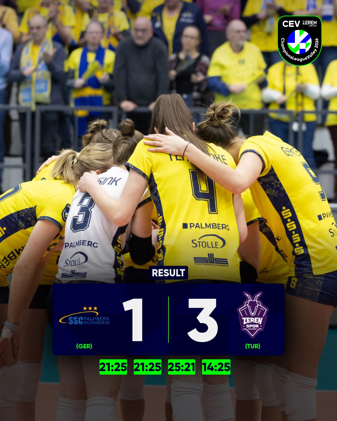 VoV, 18-02-2026. 5:00 uur. Voor het sterk Oranje gekleurde SSC Schwerin stond gisteravond de thuiswedstrijd tegen Zeren Spor uit Turkije op het programma. Het betrof een van de drie play off wedstrijden na de poulefase van de Champions League. Schwerin kon wegens een blessure aan haar linkerhand niet beschikken over midspeelster Britte Stuut. Zeren Spor had in de poulefase twee keer tegen SC Dresden gespeeld en beide keren zonder setverlies gewonnen. Een tegenstander van formaat dus.
