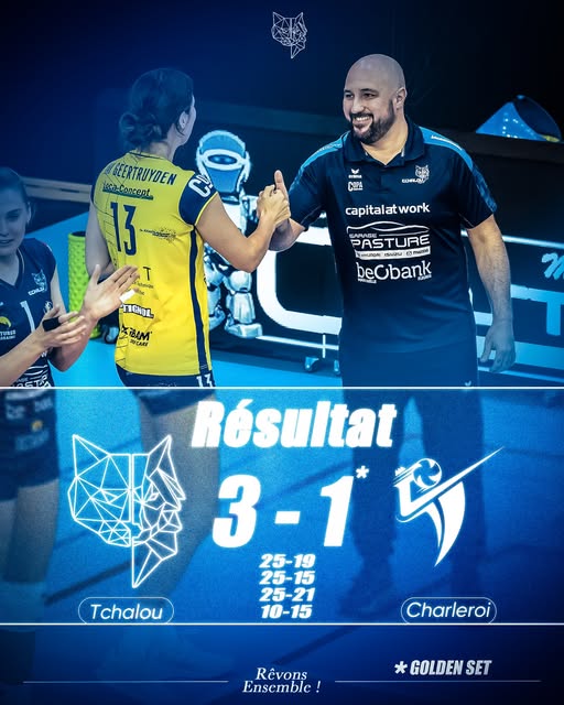 Over de wedstrijd zijn we na deze lange aanloop kort. Tchalou Volley won het duel via de setstanden 25-19, 25-15 en 25-21 met 3-0. Dat maakte een Golden Set noodzakelijk. Die werd met 10-15 door Charleroi Volley gewonnen.
