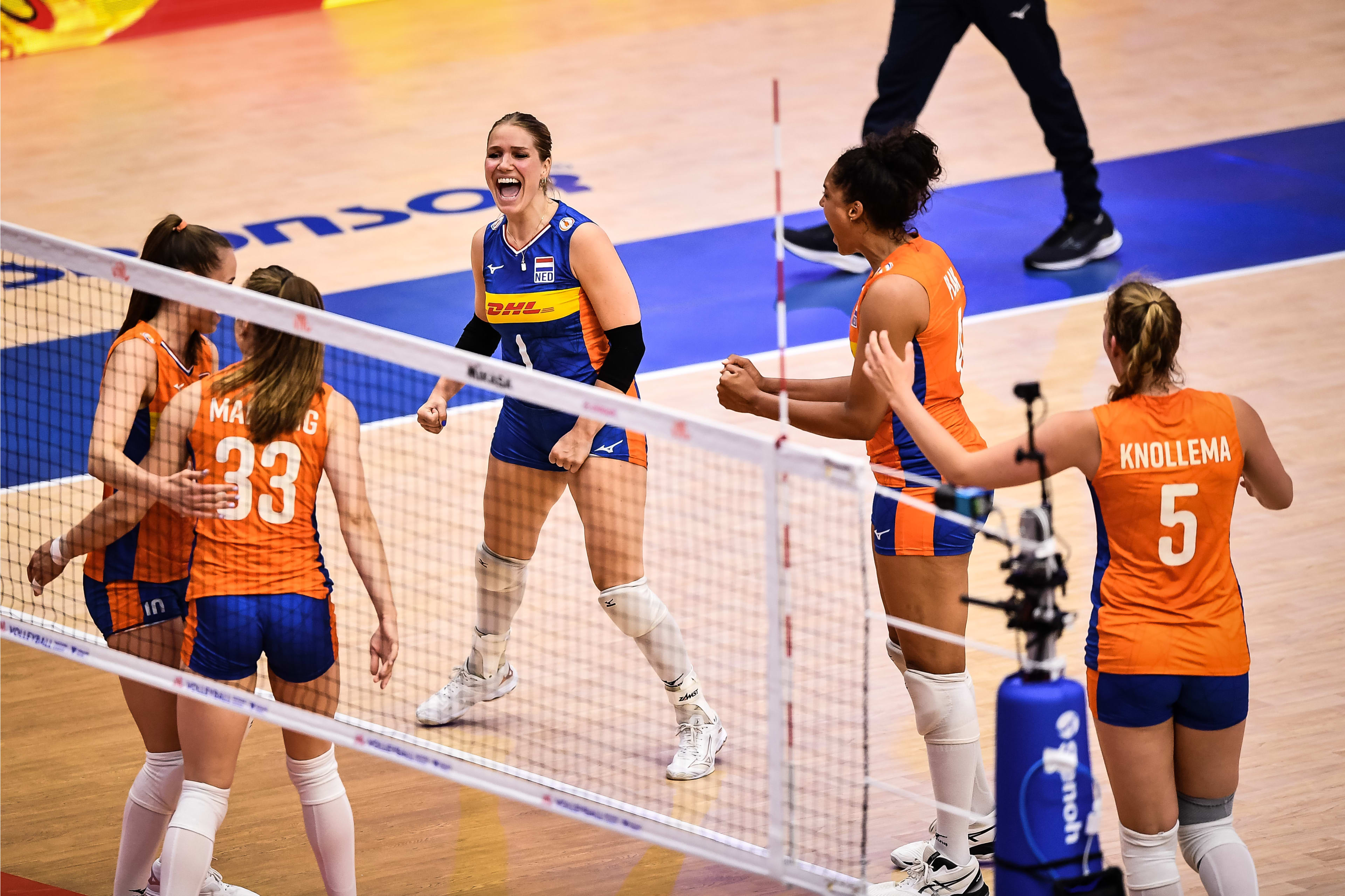 Oranje dat in de laatste wedstrijd bijzonder weinig wisselde, alleen Eline Timmerman kwam enkele keren als invalster binnen de lijnen, begon nu met op spelverdeling Sarah van Aalen, Kirsten Knip vervulde de rol van libero, Celeste Plak nam de diagonaal positie voor haar rekening, de midpositie werden ingevuld door Eline Timmerman en Indy Baijens en op de passer loper speelden Jolien Knollema en Nova Marring.