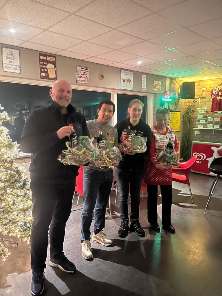 Waardering voor iedereen: Na ruim vijf kwartier konden de acht groepen zich laven aan diverse hapjes en uiteraard ontbraken de overheerlijke snackjes ook niet. Bart Raymann, Jos Ian Rijpma, Tjitske Wind en Martina Hoekstra kregen een prachtig en decoratief kerststuk mee en toonden blij verrast met hun welverdiende prijs. Alle deelnemers werden overigens niet vergeten: voor iedereen lag er ook nog een mini kerststuk klaar als waardering voor hun inzet.