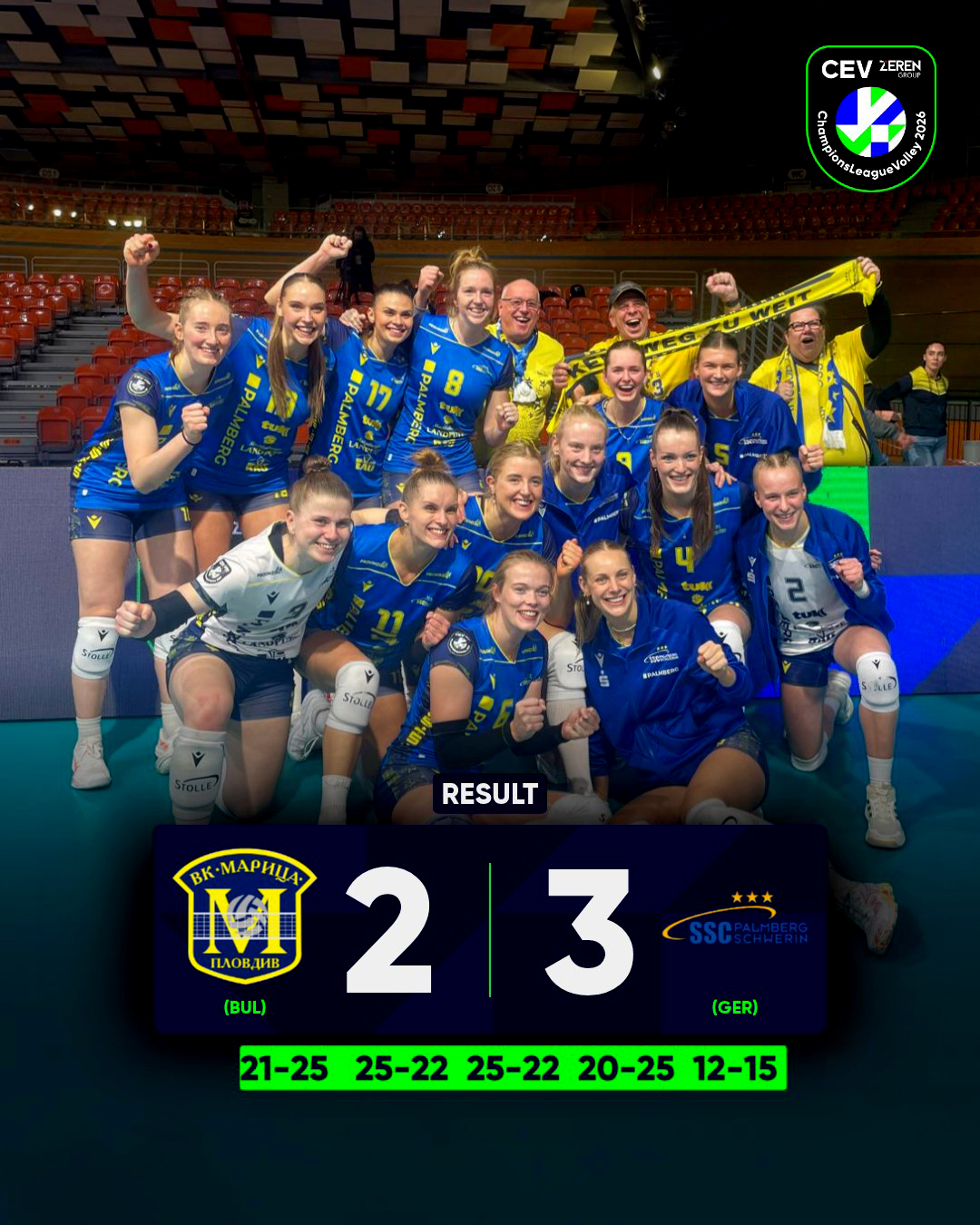 In de beslissende vijfde set nam Plovdiv via een ace de leiding bij 5-3, maar met 7-8 werd er van kant gewisseld. Schwerin sloeg zich naar een beslissend verschil bij 10-12 en stond dat niet meer af. Met 12-15 pakten zij de 2-3 wedstrijdwinst.